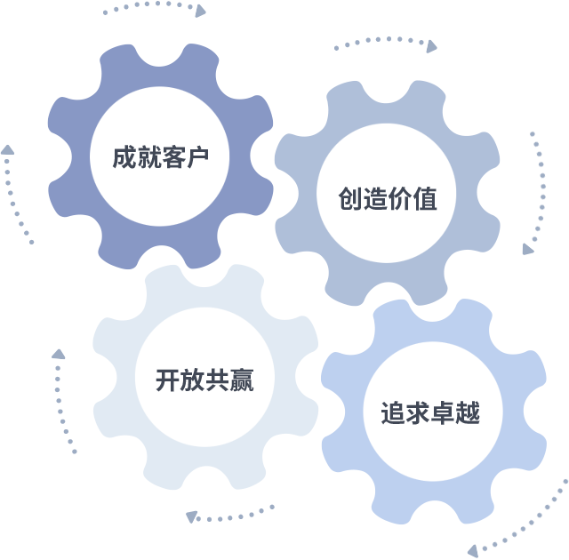 成就客户是一切决策的出发点,,,创造价值是衡量所有工作的标准,,,,追求卓越是我们做事做人的态度,,,开放共赢是我们的格局也是最终的结果。。价值观的齿轮环环相扣,,推动着组织里的每个人不断向前。。