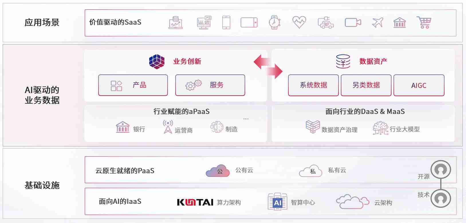 数字时代,,围绕企业数字化转型的关键要素,,南宫娱乐数码开创性的提出“数云融合”战略和技术体系框架,,着力在云原生、、、数字原生、、、、AI原生和信创产业上架构产品和服务能力,,,,为处在不同数字化转型阶段的快消零售、、汽车、、、金融、、、、医疗、、政企、、、、教育、、、运营商等行业客户提供泛在的敏捷IT能力和融合的数据驱动能力,,,,构建跨界融合创新的数字业务场景和新业务模式,,,助力企业级客户建立面向未来的核心能力和竞争优势,,,全面推动社会的数字化、、智能化转型升级。。